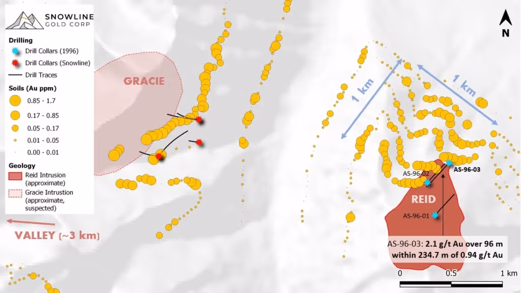 Figure 2 – Plan map of the Reid and Gracie targets, with historical drill collar sites from drilling at Reid (sky blue) and Snowline’s 2022 Phase I drilling at Gracie (red). AS-96-03 is collared downslope from AS-96-02, and thus the holes do not significantly overlap one another. While the historical drill results have not been verified by the Company, the scale of the associated soil and talus fine anomaly sampled by Snowline and the extent of mineralization observed during subsequent mapping provide additional evidence for a significant reduced intrusion-relation gold system at Reid.