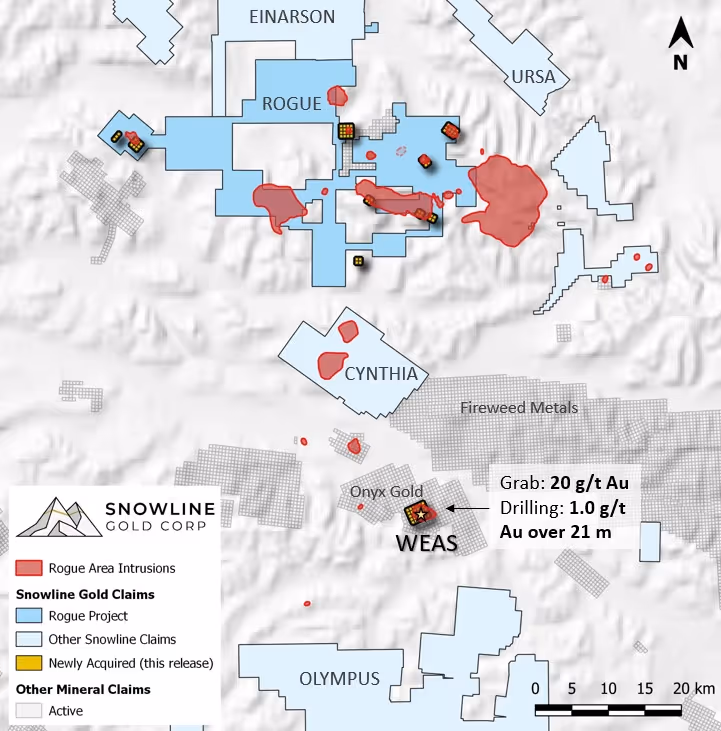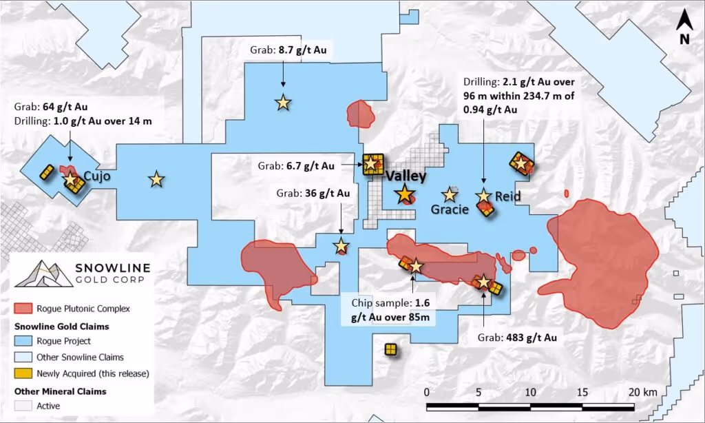 - Snowline purchases 92 long-held mineral claims (roughly 1,920 ha) constituting 10 targeted claim blocks within and adjacent to its Rogue Project