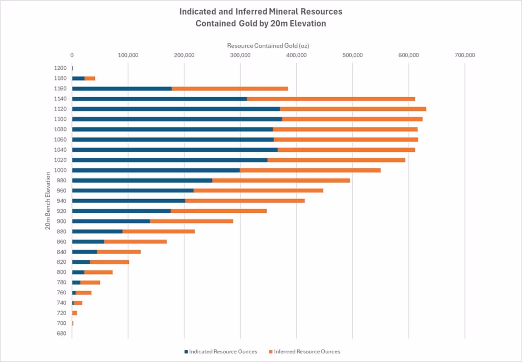 Figure 2 – Histogram of the initial MRE for Valley sorted by 20 m elevation brackets, illustrating the near-surface nature of gold distribution in the deposit. Surface elevations across the Valley deposit typically range from 1,170 m to 1,190 m.
