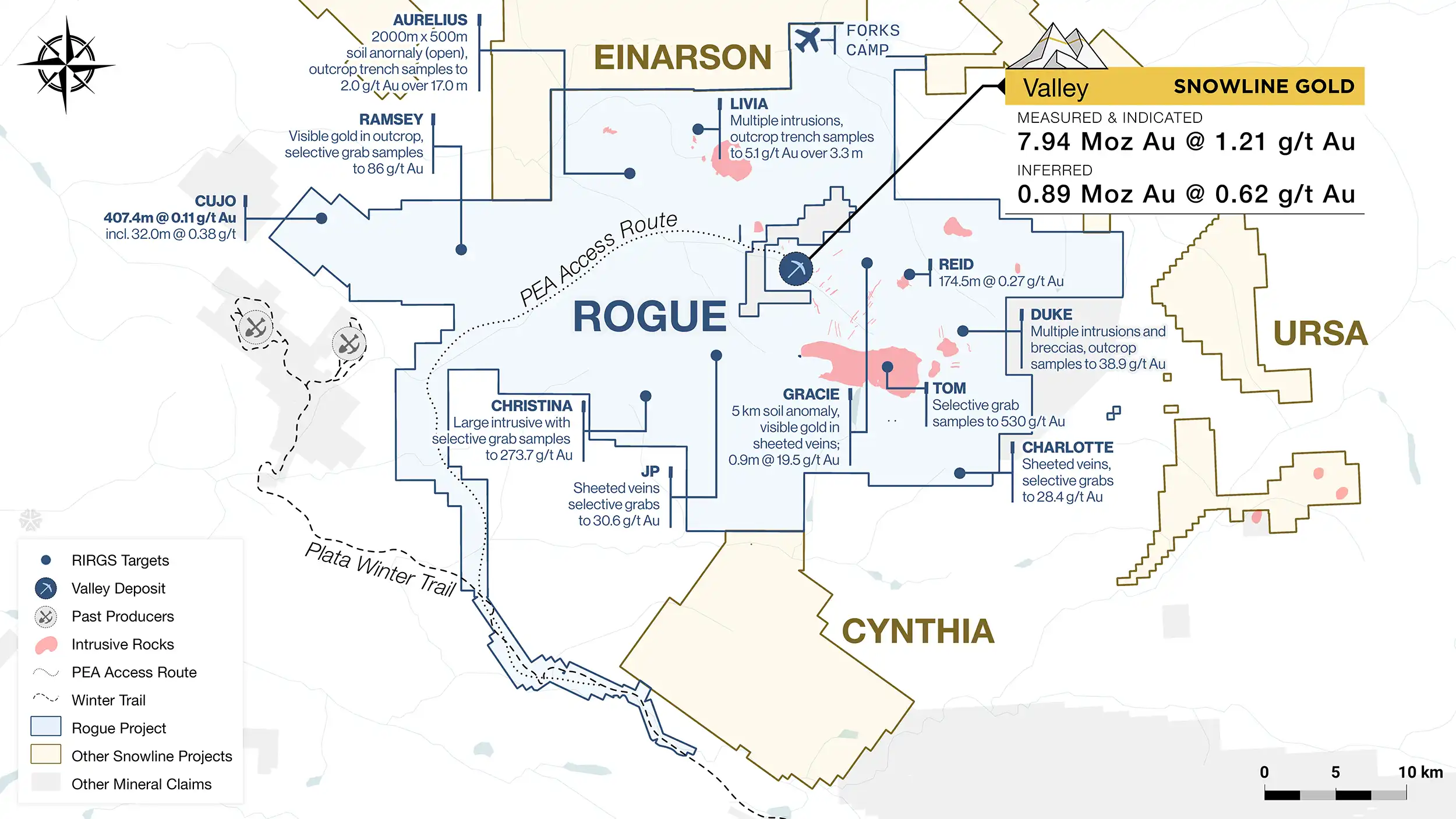 Valley's resource remains open for expansion, with district-scale exploration upside across the broader Rogue project and surrounding Snowline properties.